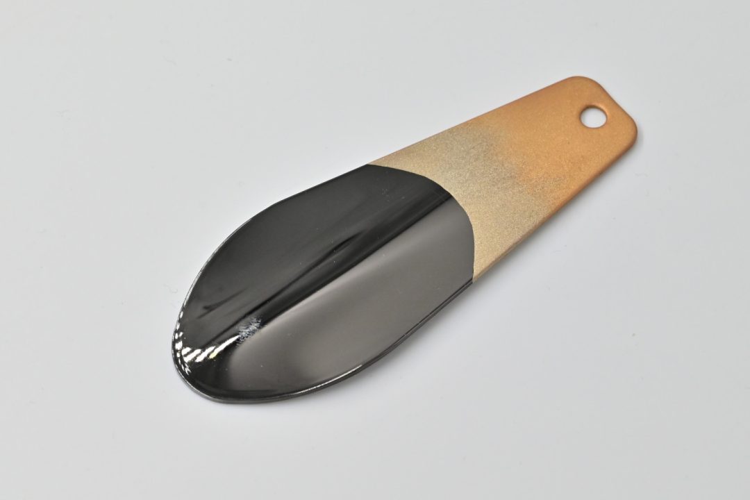 金属加工×漆塗で新しい価値を生み出すことを目指し開発した、漆塗を施した靴ベラです。漆を塗り金紛と銀紛を蒔き分けてグラデーションにしています。